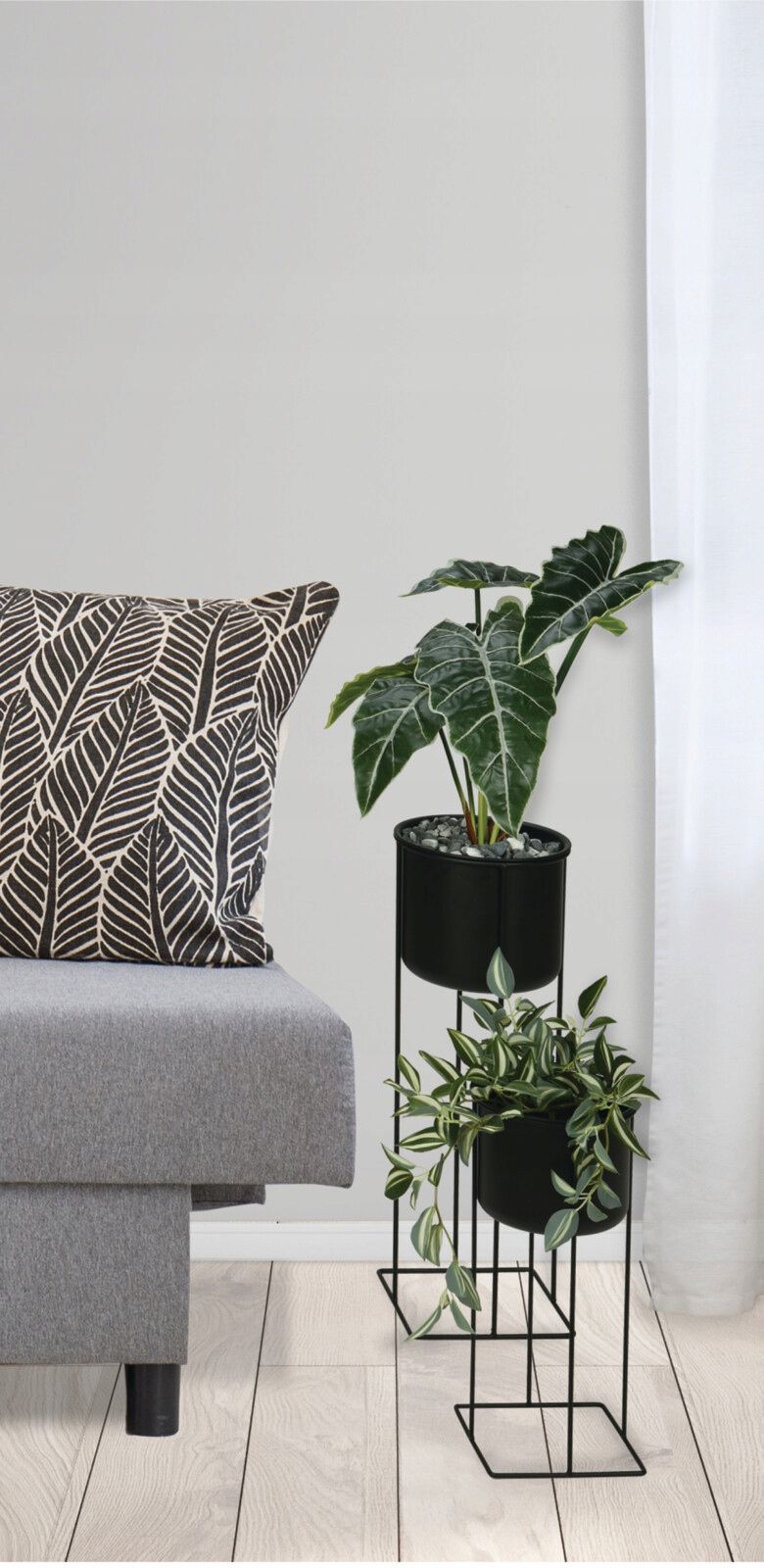 Dekorativni stoječi cvetlični lonec 58 cm. Moderno stojalo za rože, sestavljeno iz dveh prostostoječih loncev. Celotna konstrukcija je izdelana iz kovine, kar zagotavlja njeno vzdržljivost in lep zaključek. Zaradi te kombinacije klasičnega in modernega dizajna se stojalo odlično poda k notranjosti v podstrešnem ali industrijskem slogu. Lahko je čudovita dekoracija za dnevno sobo ali spalnico, poleti pa ga je vredno postaviti na teraso ali balkon, da v celoti izkoristite njegove dekorativne lastnosti. Izboljšajte estetiko svoje dnevne sobe, spalnice, hodnika ali pisarne z izbiro preverjenih, visokokakovostnih izdelkov, kot so ti. Komplet vsebuje: 1 x večji lonec: Premer: 20 cm, Višina lonca: 17 cm, Skupna višina: 58 cm, 1 x manjši lonec: Premer: 18 cm, Višina lonca: 13,5 cm, Skupna višina: 39,5 cm. Prednosti: Visokokakovostna izdelava zagotavlja odpornost na mehanske poškodbe in dolgotrajno uporabo! Stojalo za rože je zelo enostavno čistiti in pomaga ohranjati vaše prostore v brezhibnem redu. Brezčasna oblika tega stojala za rože bo dopolnila vsako notranjo opremo. Popolna ideja za darilo, ki bo navdušila vsakega ljubitelja rož. Specifikacije: Proizvajalec: Koopman Material: Kovina Slog: Podstrešni, industrijski, moderni Barva: Črna Skupna višina večjega lončka: 58 cm Premer večjega lončka: 20 cm Skupna višina manjšega lončka: 39,5 cm Premer manjšega lončka: 18 cm Uporaba: Stojalo za rože, cvetlični lonček Cena velja za en komplet (dva lončka)