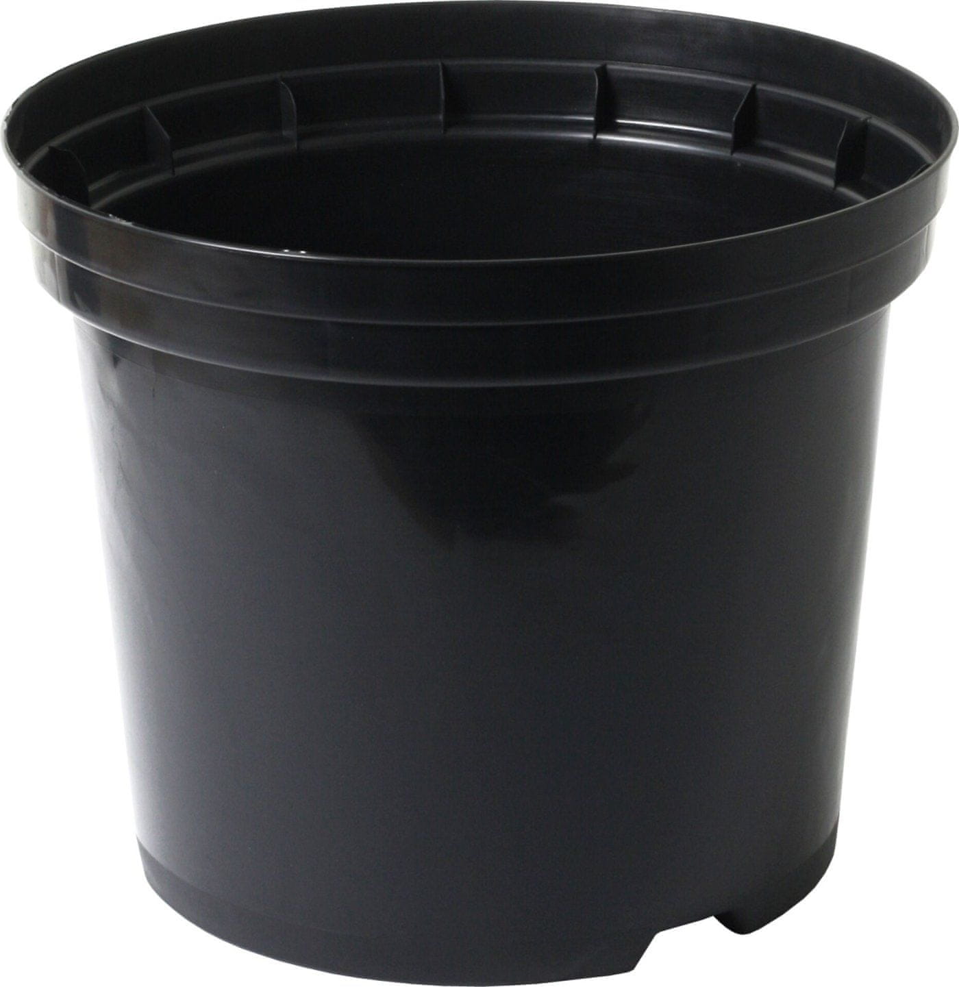 Okrogla črna plastična posoda je namenjena gojenju rastlin. Uporablja se predvsem za sajenje. Na voljo je v številnih velikostih.