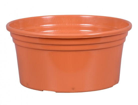 Plastični jardin, gladek, mat. Okrašena je s tremi dvignjenimi vodoravnimi črtami po vsej površini. Zgornji rob je zaradi lažjega rokovanja prepognjen. Primerna za cvetlične kompozicije za okrasitev spominskih obeležij. Odporna na vremenske vplive. Dimenzije: premer 14 cm, višina 7 cm. Barva: terakota.