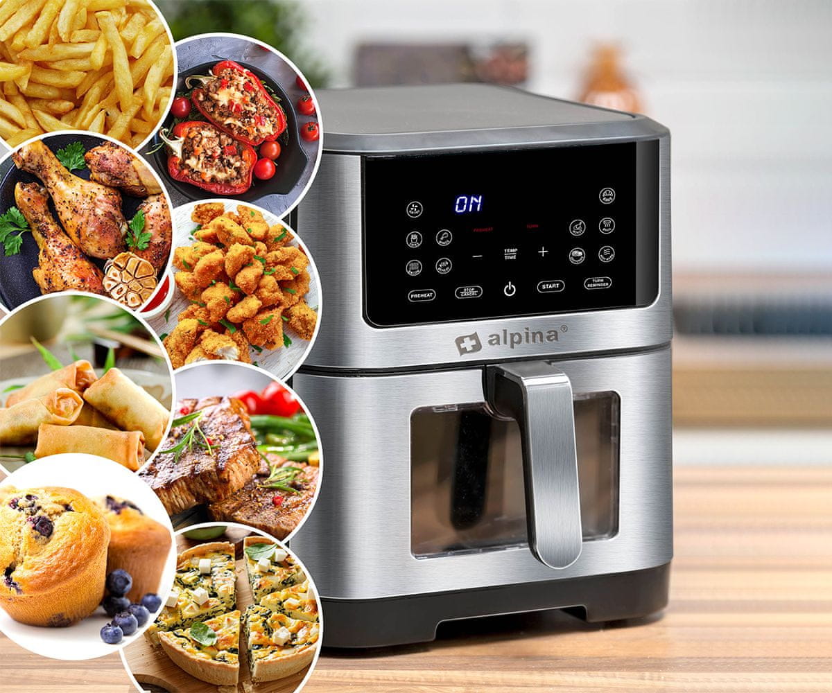 Za doseganje takšnih rezultatov ne potrebujete olja ali pa ga morate dodati le nekaj kapljic. Cvrtnik ALPINA deluje na principu segrevanja zraka, rezultat pa je lepo zapečena, mehka in sočna notranjost, na vrhu pa nastane hrustljava skorjica, kateri se ne boste morali upreti. Enostavno in hitro lahko pripravite različne vrste mesa, zelenjave, prigrizke, piškote, pecivo ali kruh.