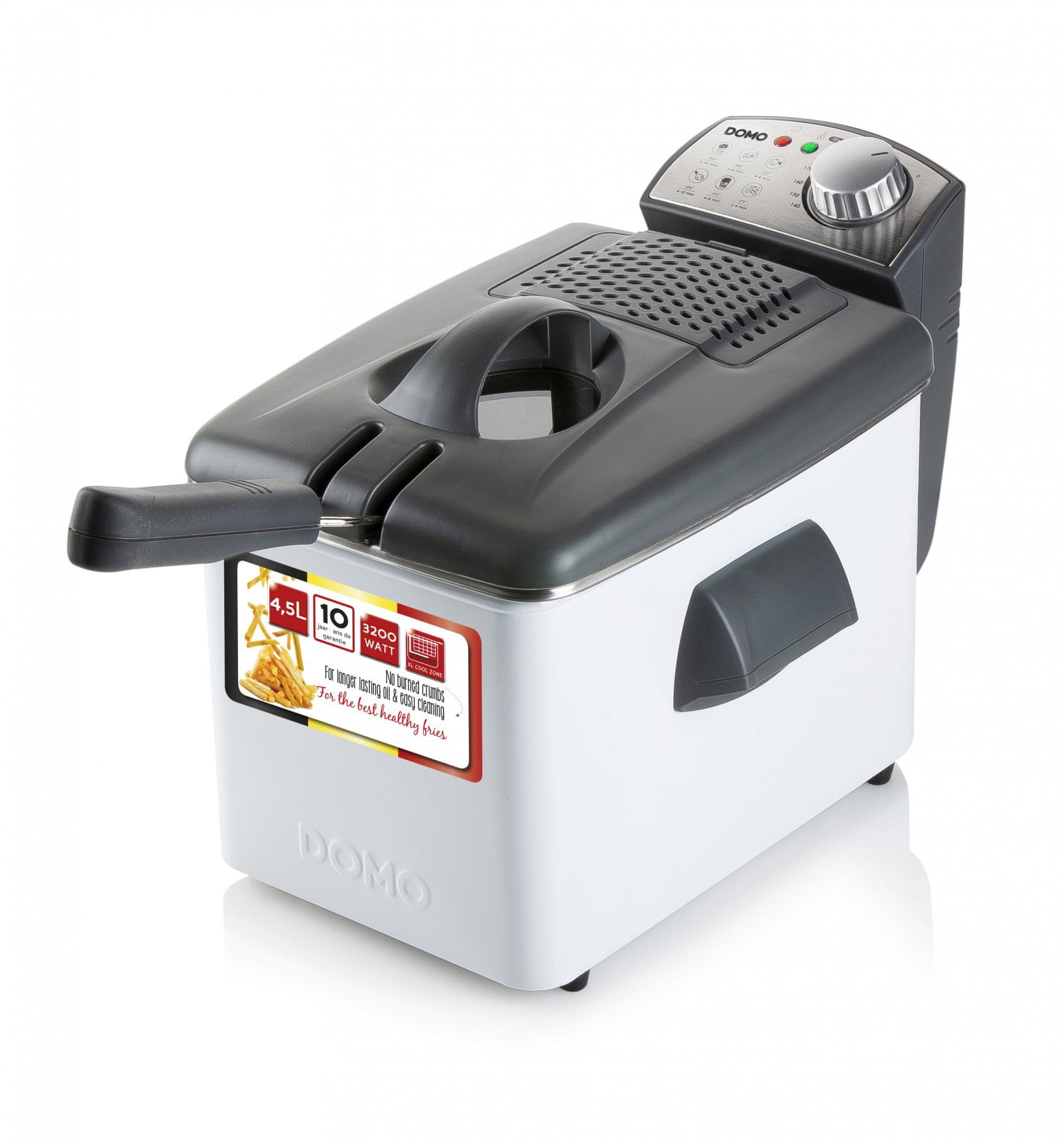 Na nadzorni plošči DOMO DO519FR 4,5L lahko najdete prave nastavitve za krompirček, piščanca, ribe in druge prigrizke. Cvrtnik ima grelni element s 3 zankami, tako da se hitro in enakomerno segreje. Zahvaljujoč prozornemu oknu lahko pazite na svoje prigrizke. Če jih vidite, kako plavajo, veste, da so pripravljeni. Zaradi filtra za vonjave vam ni treba cvreti zunaj ali v lopi. Po uporabi lahko kabel shranite v zadnji del cvrtnika, da ga lahko pospravite.