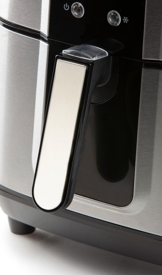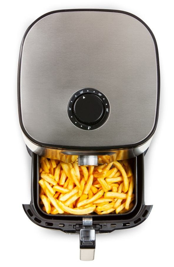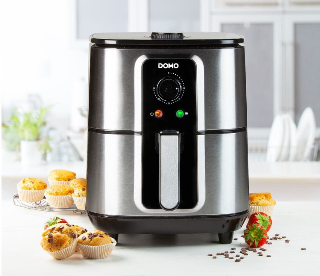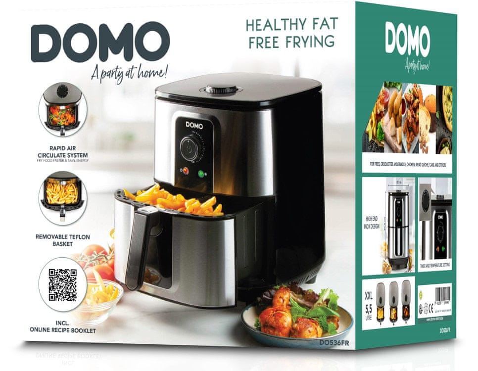 DOMO DO536FR je cvrtnik na vroč zrak s preprostim mehanskim upravljanjem. Pravokotna košara za cvrtje v svoji prostornini sprejme do 5,5 kg surovin. Brez uporabe olja, samo z vročim zrakom in s hitrim segrevanjem v 3 minutah, lahko cvrtnik pripravi popoln zdrav pomfrit iz krompirja ali zelenjavo, speče sočno meso ali zelo hitro in nežno segreje pripravljene jedi ter ponovno pogreje zamrznjene sestavine.