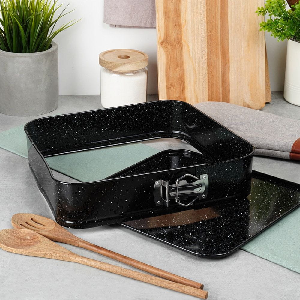 Kvadratni vzmetni pekač za peko tort in torte. Stranice, ki jih ni mogoče zapreti, omogočajo priročno odstranjevanje pečenega kolača, uporabne pa so tudi pri čiščenju pekača. Obvezna oprema v vsakem domu. Izdelan iz najkakovostnejših materialov, ki zagotavljajo udobje pri uporabi.