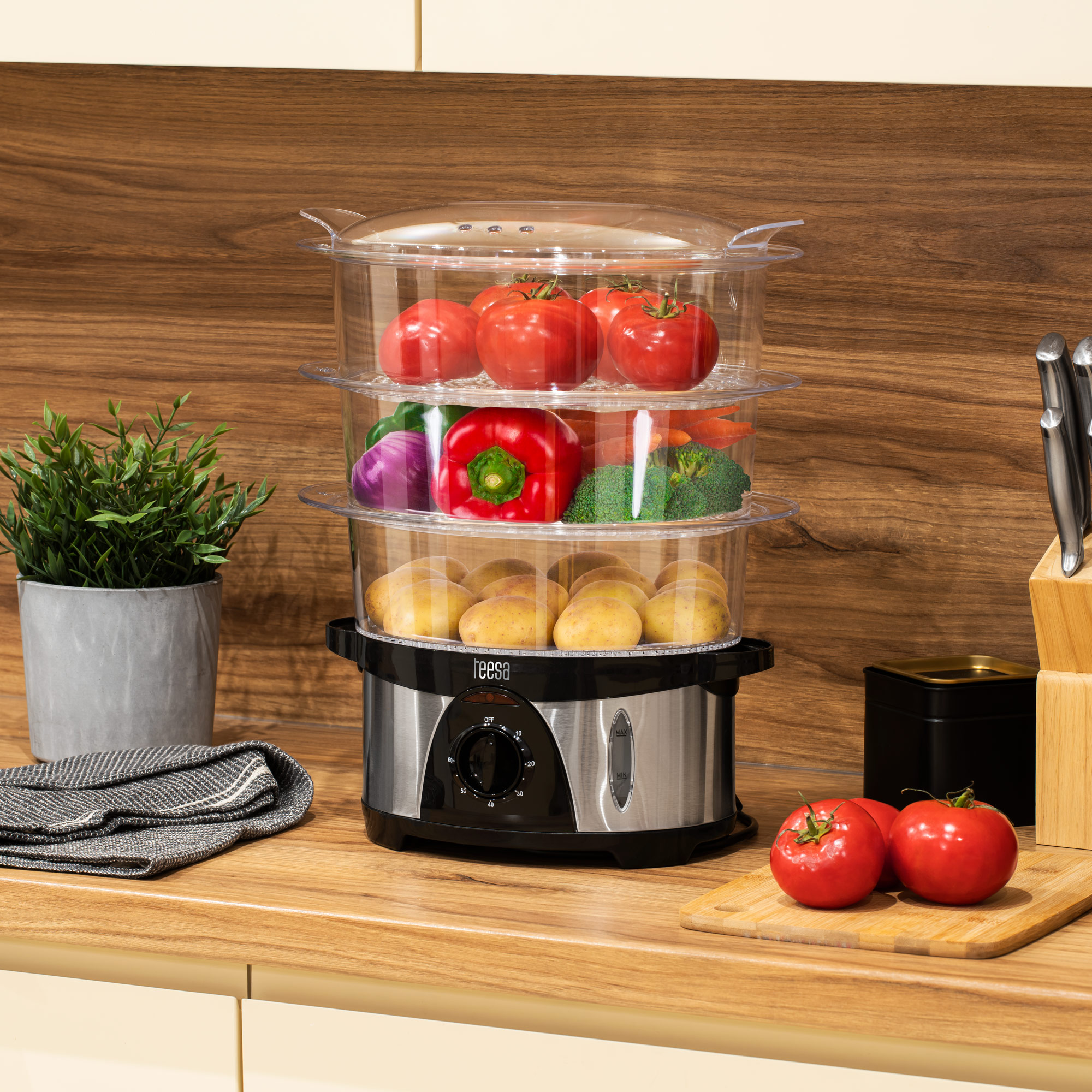 Se sprašujete, kako kuhati na pari? Kupite parni kuhalnik Teesa TSA0035 750 W, ki bo spremenil vaše kuhanje. Velika prostornina 9,6 L v kombinaciji s tremi priročnimi posodami vam bo omogočila hitro pripravo zdravega in okusnega obroka za vso družino. Še več, soparnik Teesa poskrbi, da bodo jedi, kuhane na pari, imele manj kalorij in manj maščob, kar vam bo pomagalo ohraniti vitko linijo.