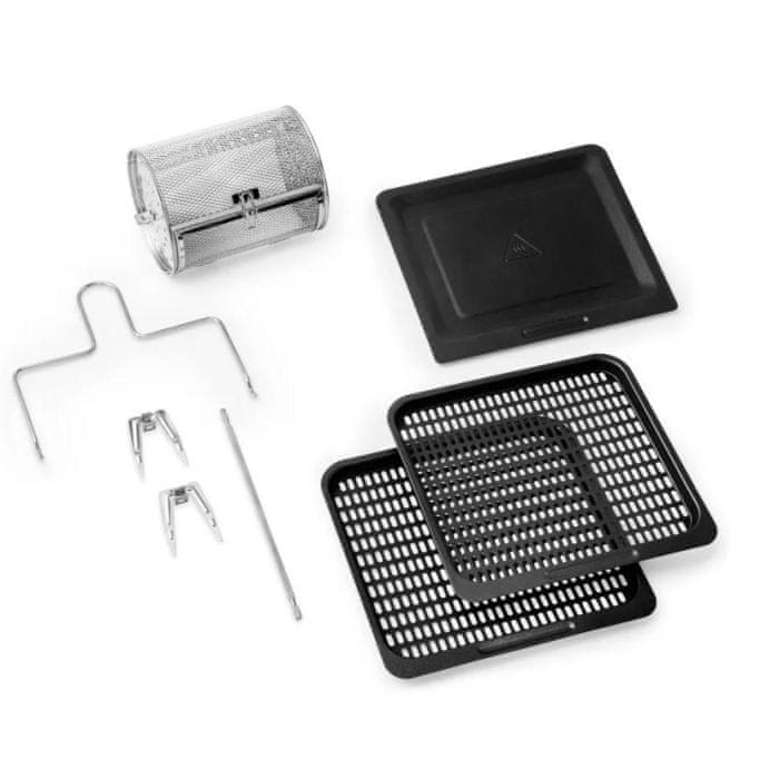 - Vključenih je 6 dodatkov: 2 pladnja za peko, pladenj za zbiranje olja, izvlečne klešče, 2,9-litrska vrtljiva okrogla košara in kavlji za peko.