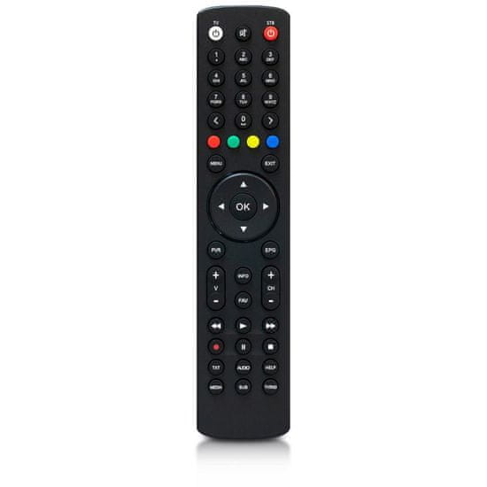 Daljinski upravljalnik za AB CryptoBox in PULSe Originalni programabilni daljinski upravljalnik za satelitske sprejemnike in sprejemnike DVB-T2 Omogoča programiranje osnovnih funkcij za upravljanje televizorja Segmentacija skupin gumbov Optimalnejša razporeditev gumbov za množično usmerjanje Univerzalni gumbi za televizor: POWER, VOL+, VOL- Gumbi OK, smerni gumbi, gumbi MENU, EXIT, PVR, EPG so razporejeni enako kot v izvirnih različicah upravljalnikov AB CryptoBox in PULSe