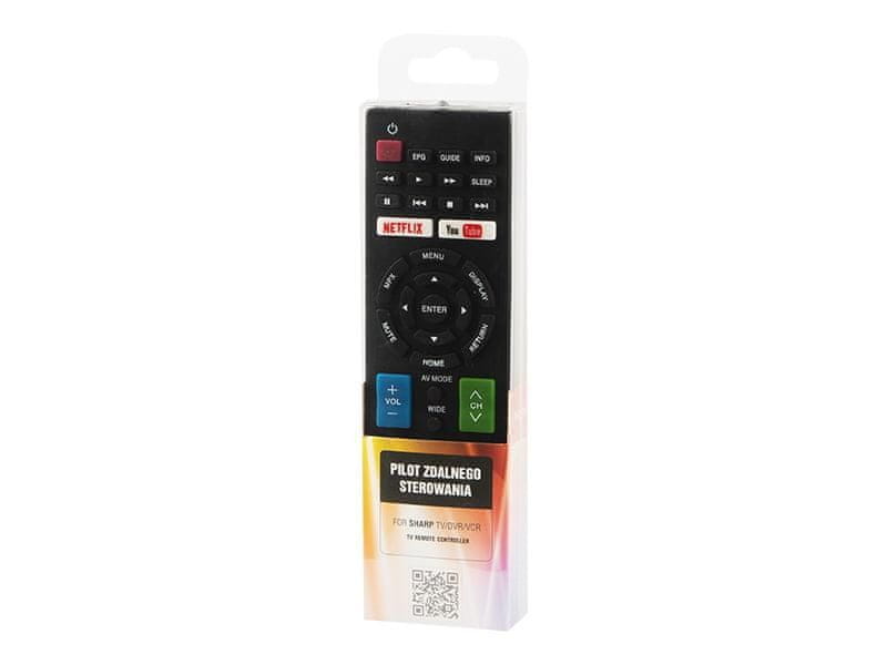Univerzalni daljinski upravljalnik, ki omogoča upravljanje naslednjih Sharp naprav: TV, VCR, DVR. Izdelek ima potrebne gumbe za osnovno delovanje teh naprav ter dodatno ločene gumbe za zagon priljubljenih storitev Netflix in Youtube. Enostavna oblika in postavitev zagotavljata popolnoma enostavno in intuitivno upravljanje. Za izdelavo pilota so bili uporabljeni visokokakovostni materiali, ki zagotavljajo dolgo obstojnost izdelka. Idealen za nadzor vaše naprave, ko se tovarniški daljinski upravljalnik izgubi ali poškoduje.