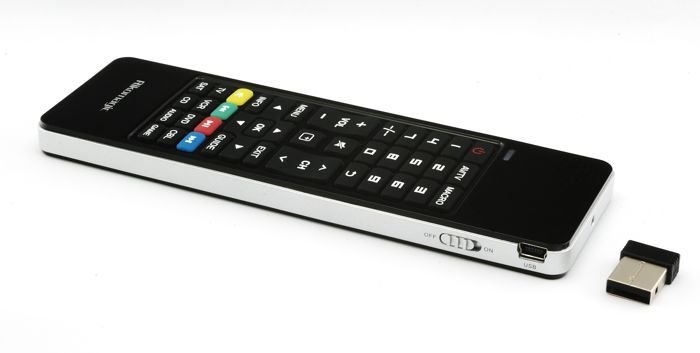 Univerzalni multimedijski upravljalnik Fly Mouse MK702II – v visoko kakovostnem plastičnem ohišju ponuja funkcijo 4 naprav v eni: brezžična tipkovnica, Air miška (6-axis Gyro senzor), IR daljinec in zvočnik-mikrofon.