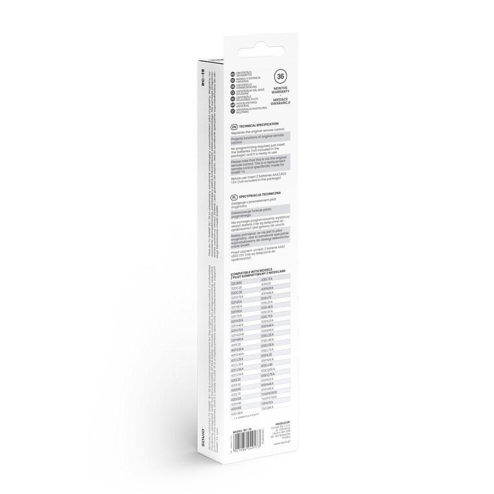 Nudimo daljinski upravljalnik Savio RC-19, ki je odlična rešitev za lastnike televizorjev Sharp. Zahvaljujoč modernemu dizajnu in ergonomski konstrukciji zagotavlja udobno uporabo in enostaven dostop do vseh funkcij televizorja. Ta daljinski upravljalnik je odlična alternativa izgubljenim ali poškodovanim originalnim daljinskim upravljalnikom, zaradi svoje vsestranskosti pa je primeren za številne modele televizorjev.