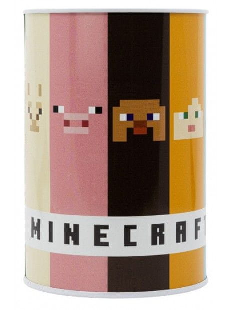Kovinska blagajna z motivom Minecrafta. Po obodu so večbarvne črte z obrazi verjetno vseh likov iz te računalniške igre in napisi Minecraft. Celoten opis