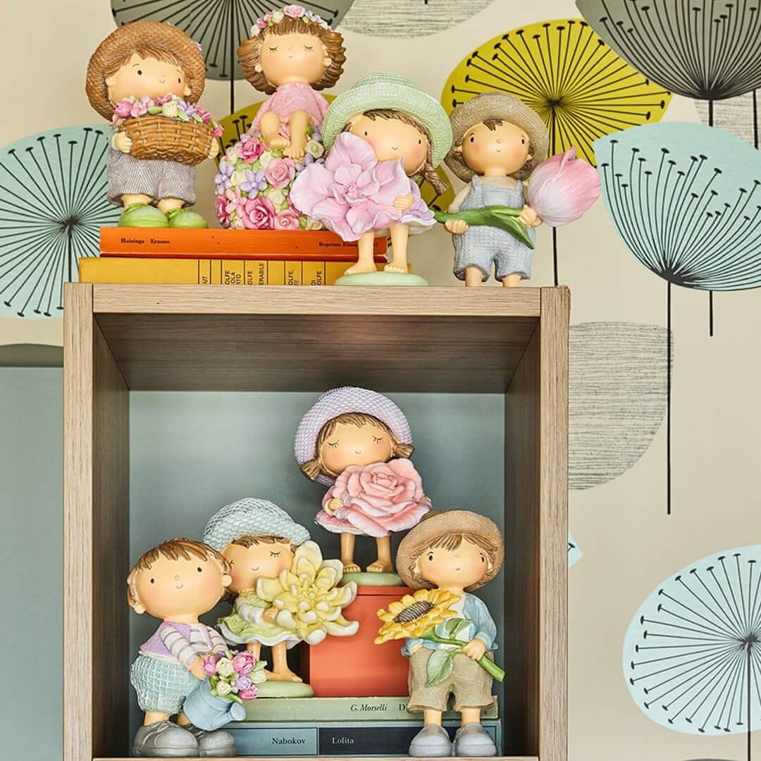Dekorativni kipec dečka s tulipanom je čudovit dodatek za popestritev doma ali verande. Izdelan je iz kakovostne umetne mase – poliresina, ki omogoča natančno izdelavo detajlov in zagotavlja obstojnost. Z višino 15 cm je ravno prav visok, da pritegne pozornost, hkrati pa se lepo poda tudi v manjše prostore. Motiv dečka s košaro rož ustvarja prijetno, toplo in romantično vzdušje. Kipec lahko postavite na polico, komodo, okensko polico ali mizo, lepo pa se poda tudi na balkon ali teraso kot dekorativni poudarek.