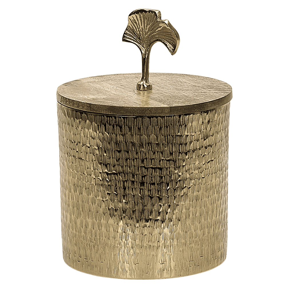 Ta dekoracija je praktična in dekorativna ter je idealna za shranjevanje vseh majhnih predmetov in pripomočkov za osebno higieno. Izdelan je iz lahkega aluminija z zlatim zaključkom in se odlično poda v glamur ali moderne prostore. Lesen pokrov z okrasnim ročajem daje posodi poseben čar in ji daje naraven poudarek.