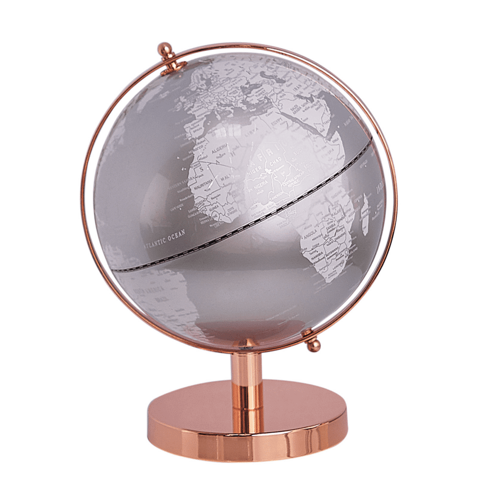 Srebrni globus na stojalu iz rožnatega zlata je edinstven okras, ki bo krasil vsako dnevno sobo ali domačo knjižnico. Kovinska barva in sodobna zasnova se odlično ujemata s katerim koli slogom notranjosti. Globus je videti odlično na pisalni mizi ali v knjižni omari, prav tako pa je odlično darilo za vsakega popotnika.