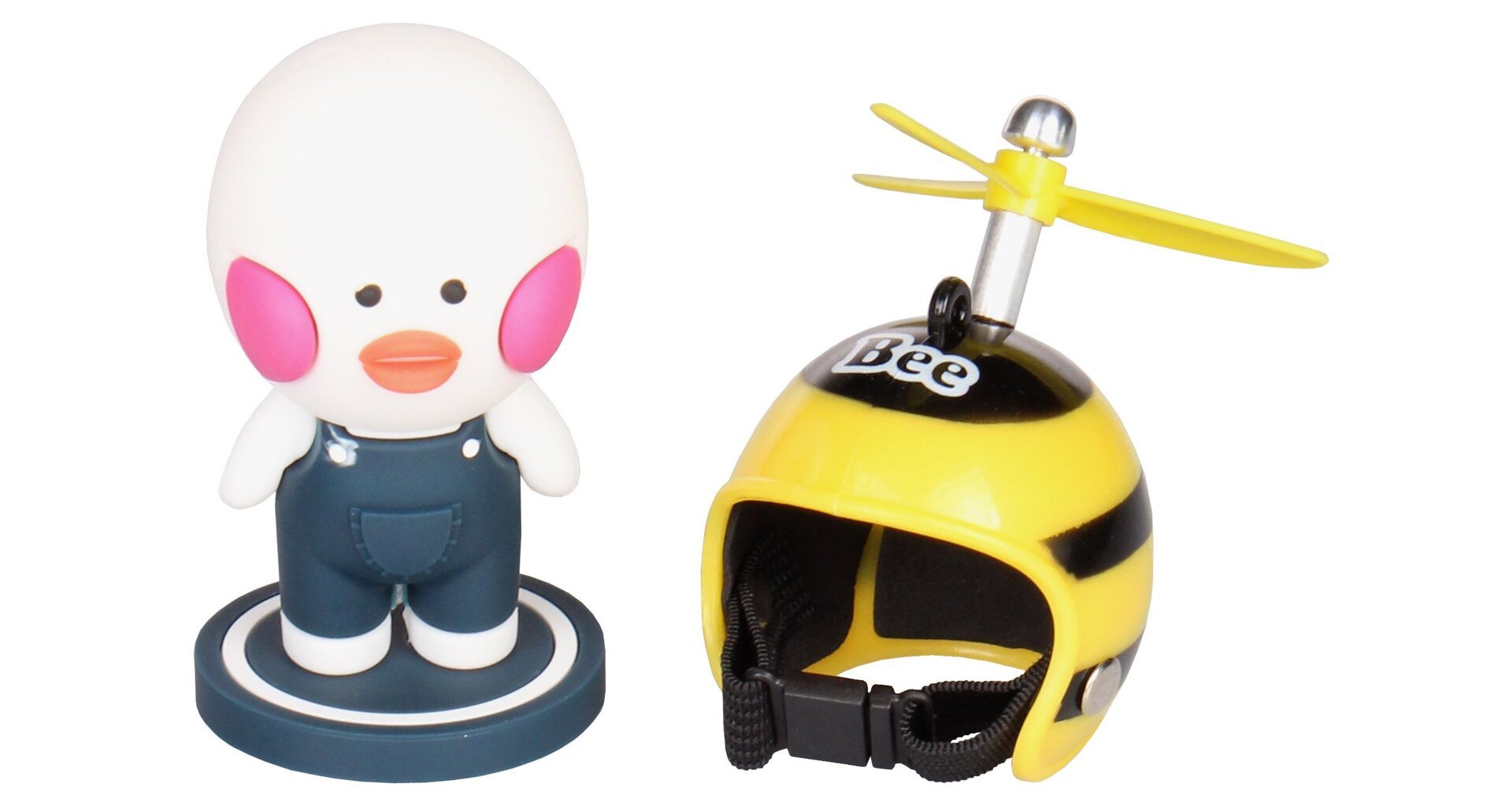 Dekorativna račka Bee elegantnega videza bo nasmejala vsakega otroka. 9 cm visoka figura bo krasila vsako polico, mizo ali avtomobilsko palubo. Zahvaljujoč samolepilni nalepki na spodnjem delu figurice lahko račko trdno pritrdite na omenjena mesta. Čelado s propelerjem lahko snamete ali si jo nadenete. Čelada ima rumeno-črni motiv čebele. Zberite celoten komplet račk, ki ga najdete v naši ponudbi. Parametri: mere: 9 × 4 cm teža: 56 g material: PVC, ABS