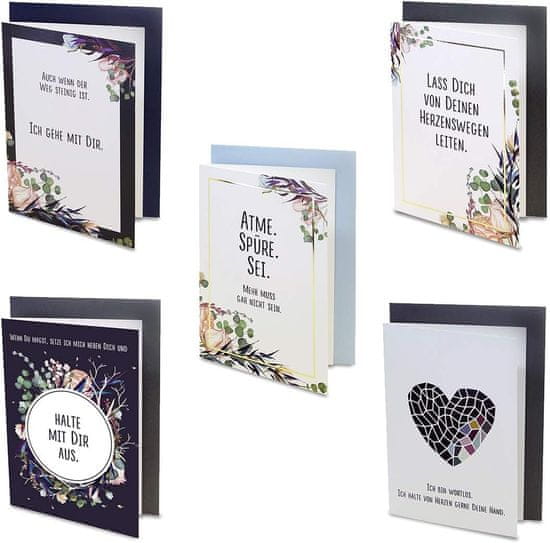 Izrazite svojo podporo in sočutje v težkih trenutkih z Kompletom sožalnih kartic Toni Trauert. Ta komplet je zasnovan za prenos podpore in je edinstven komplet kartic za težke življenjske situacije, kot so žalost, strah, ločitev, ljubezen, selitev in stres. Vsebuje 15 skrbno oblikovanih sožalnih kartic, vsaka s pripadajočo kuverto, kar omogoča elegantno in diskretno izražanje sožalja. Sočutna sporočila na sodobnih sožalnih karticah so podprta z edinstvenim dizajnom, ki dodaja osebni izraz in omogoča individualno pisanje sporočil.