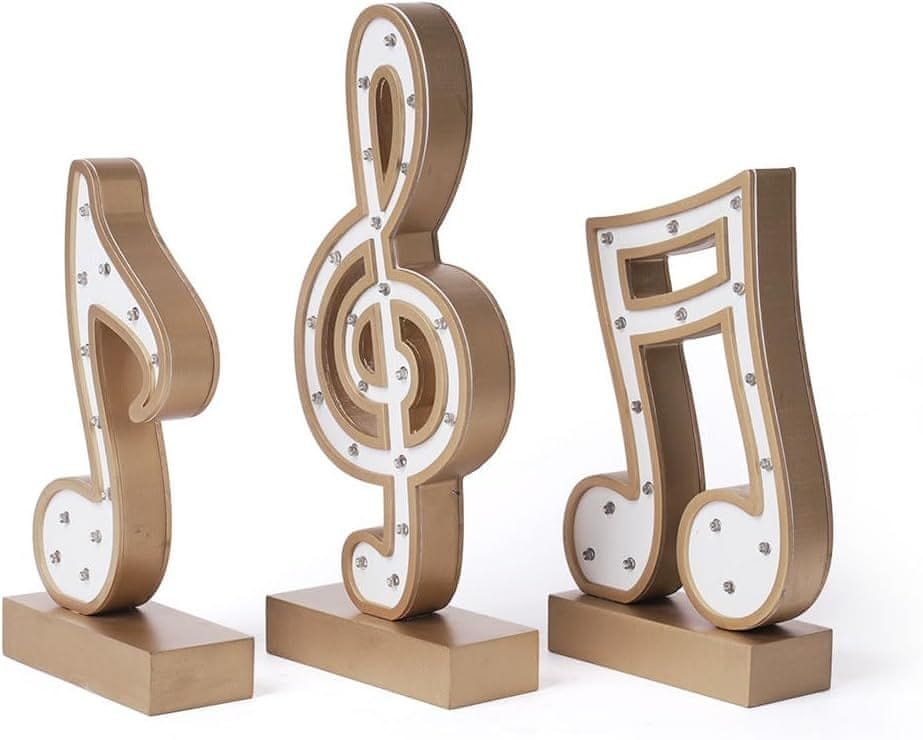 Nikcorp Moderna namizna LED svetilka v obliki glasbenih not, 3-delna lesena dekoracija za dom, zlata, 29 cm