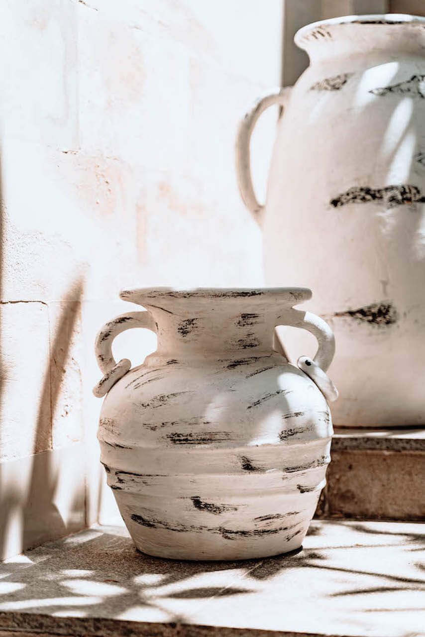Terakota, iz katere je izdelana ta vaza, je naravni, porozen material, ki se pogosto uporablja v ročnih delih. Telo vaze je skrbno žgano in nato ročno pobarvano v elegantno belo barvo. Okrasni ročaji so edinstven poudarek, ki poudarja njen prvotni značaj.