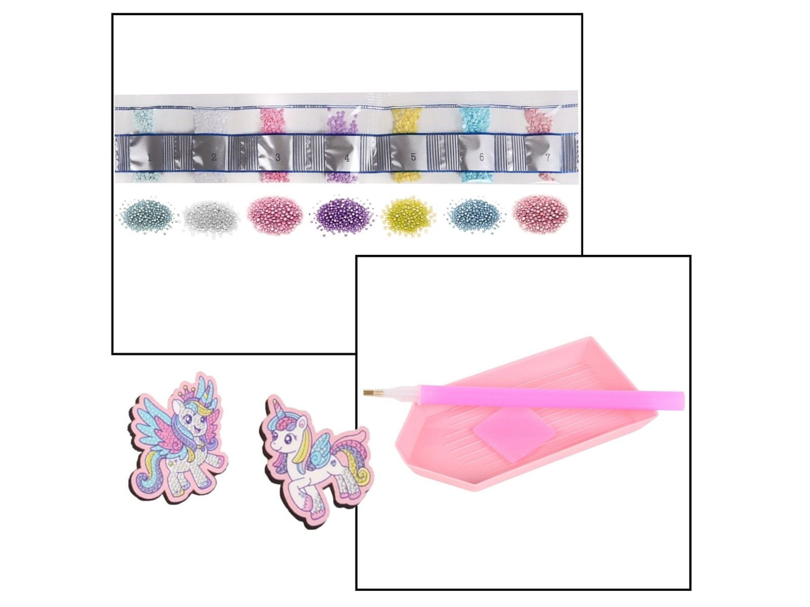 Vključuje dve magnetni šabloni z očarljivimi enorožci, pisalo za nanašanje in cirkone v sedmih barvah.