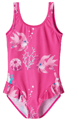 Dvodelne roza kopalke so idealna izbira za majhne oboževalke njihove najljubše risanke. Ta dekliški kopalni kostum se odlikuje s prikupnimi naramnicami z okrasnim volančkom, ki mu dodajo nežnost in čar. Hlačke imajo prav tako volančke, ki harmonično dopolnjujejo zgornji del kopalk. Kopalke so izdela