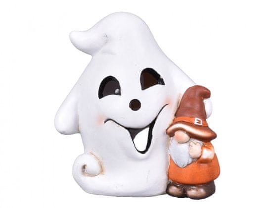 Dekoracija v obliki duha s škratom je primerna za noč čarovnic. Pomagal bo ustvariti vzdušje za vse ljubitelje tega praznika. Primeren je tudi kot svečnik za čajno lučko, ki dopolni celoten videz. Material: terakota. Primeren za uporabo v zaprtih prostorih in na prostem. Dimenzije: dolžina 15 cm, globina 9 cm, višina 16 cm. Barva: bela, oranžna.