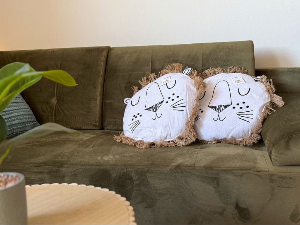 Okrogla dekorativna blazina LION s premerom 40 cm pritegne s prikupnim motivom levčka, ki ga bodo otroci še posebej vzljubili. Nežna bela barva v kombinaciji z veselimi ilustracijami in grivo iz prijetnega materiala prinaša igriv element v vsak otroški sobi. Celoten opis