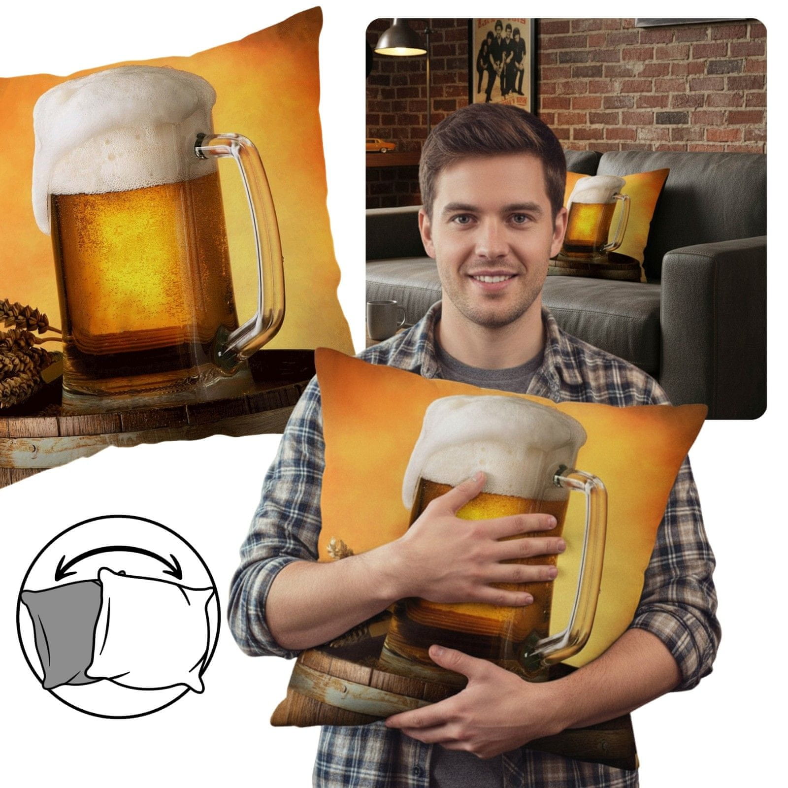 Poudarki izdelka: Oblikovanje: realističen tisk, ki prikazuje vrč piva. Velikost: 40×40 cm – praktičen format za notranjo dekoracijo. Material: mehka mikrovlakna. Obojestranski tisk: grafika na obeh straneh blazine. Polnilo: pripravljeno za uporabo, dodatna prevleka za blazino ni potrebna. Celoten opis