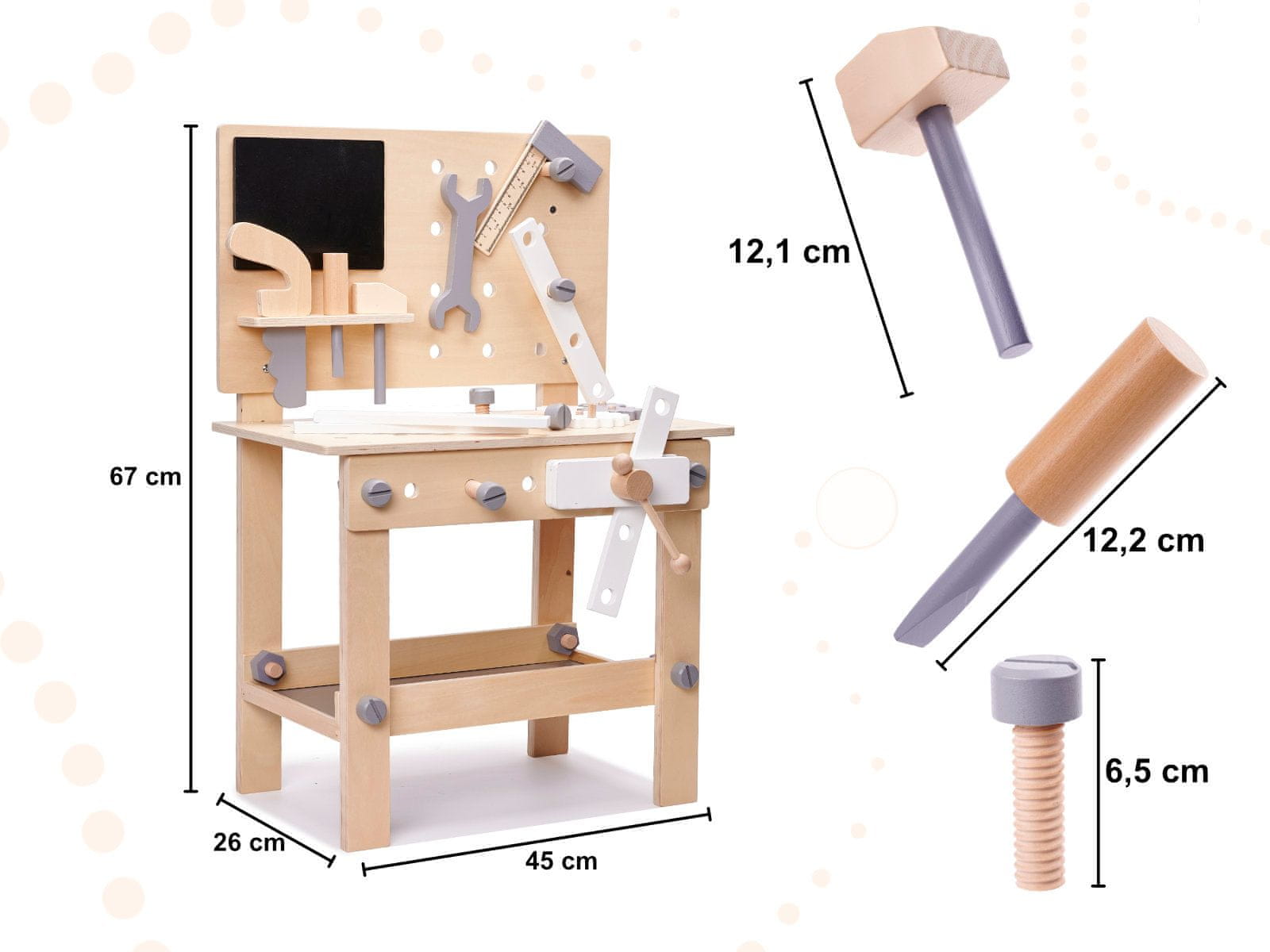 SET DELAVNICA + OROŽJE Vsak mojster potrebuje delavnico z orodjem. Ta čudovit, velik lesen set bo uresničil sanje vsakega malega mojstra. Izvijači, kladivo, vijaki, zobniki – vse to so predmeti, potrebni v profesionalni delavnici. Majhna tabla bo dodatna zanimivost, na njej pa boste lahko napisali načrt ukrepov ali začrtali projekt. Odlična igrača, ki bo otroka popeljala v svet odraslih in mu omogočila, da prevzame vlogo pravega „mojstra“. Možnost neomejenega vrtanja, zabijanja žebljev in žaganja bo otroka zelo razveselila. Miza bo označila igralni prostor in tako rešila pohištvo in stene pred morebitnimi poškodbami malega restavratorja. Ker je urejenost bistvenega pomena, bo miza vašega otroka spodbujala k vzdrževanju čistoče na delovnem mestu. Poskrbite za razvoj svojega malčka! Delavnica ni le način zabave, temveč tudi oblika učenja in razvoja. Vijačenje, pribijanje ali žaganje je odličen način za urjenje ročnih spretnosti. Poleg tega igrača spodbuja logično razmišljanje in kreativno mišljenje. Zabava se začne že ob sestavljanju. Povabite otroka, naj se vam pridruži pri sestavljanju igrače, saj bo zagotovo užival in hkrati razvijal spretnosti sodelovanja. Delavnica je predlog za odlično zabavo, razvoj in odlična ideja za darilo za malega ljubitelja orodja. Vsebina kompleta: Samostojno sestavljiva namizna žaga Izvijač 11 vijakov 6 pokrovčkov za vijake Ključi za ključe Ključi za zobnike Merilni trak Kladivo Plastika : les Dimenzije: Delavnica: 45cm x 26cm x 67cm Višina vrha (merjeno od tal): 37 cm Embalaža: 31 cm x 59 cm x 8 cm