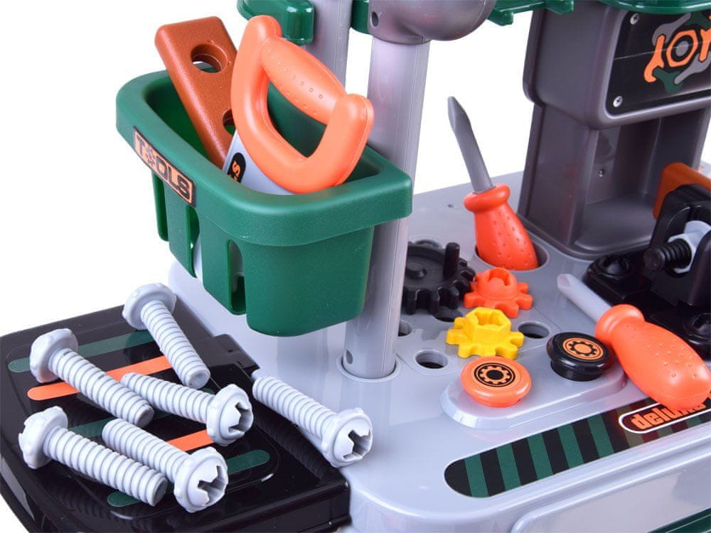 Večdelni komplet za malega mojstra se bo dobro obnesel v vsaki otroški garaži. Komplet 3 v 1 je kovček, delavnica in namizna plošča za mladega mojstra. Celoten set je narejen iz plastike, zaradi modularnega sistema pa je otrok tisti, ki se odloči, kakšno obliko bo imela njegova delavnica.
