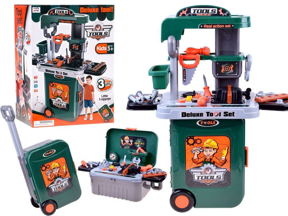 Set 3 v 1 je kovček, delavnica in namizna plošča za mlade mojstre. Celotna je izdelana iz plastike in zahvaljujoč modularnemu sistemu je od otroka odvisno, kakšno obliko bo imela njegova delavnica.