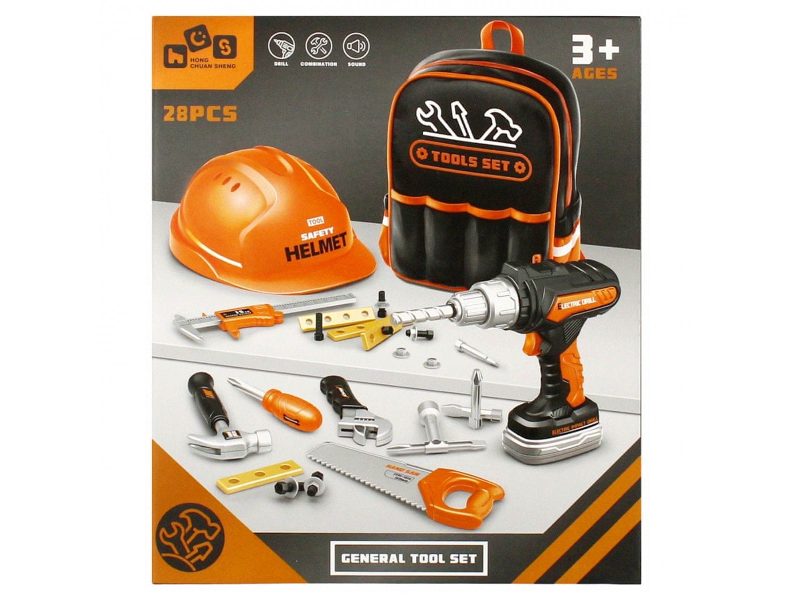 Vsebuje čelado, vrtalnik z gibljivim elementom, kladivo, ključe, žago, izvijač ter vijake in nastavke, ta komplet omogoča otroku učenje uporabe delavskih orodij na varen način.