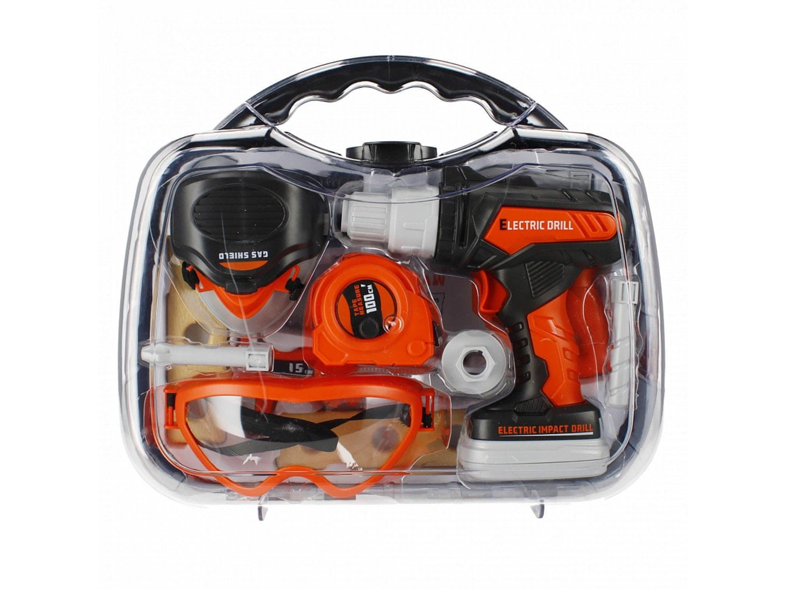 Eleganten prozoren kovček vsebuje različna orodja, kot so električni vrtalnik + 3× sveder, meter, zaščitna očala, zaščitna maska, ročna žaga, merilni trak, 2× vijak + 2× matica, 1× majhna deska, 1× velika deska, dodatki, potrebni za popravila in igro naredi sam.