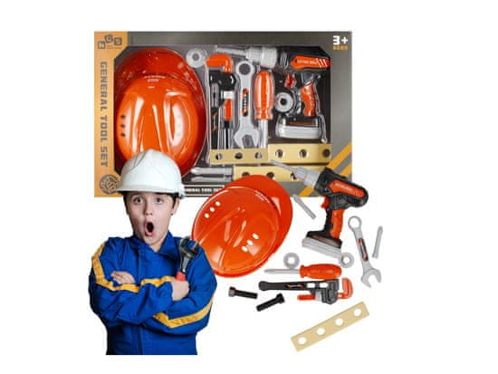 Set vsebuje čelado, vrtalnik z gibljivim svedrom, izvijač z dvema nastavkoma, francoski ključ, ključ, vijake z nastavki ter dve deski.