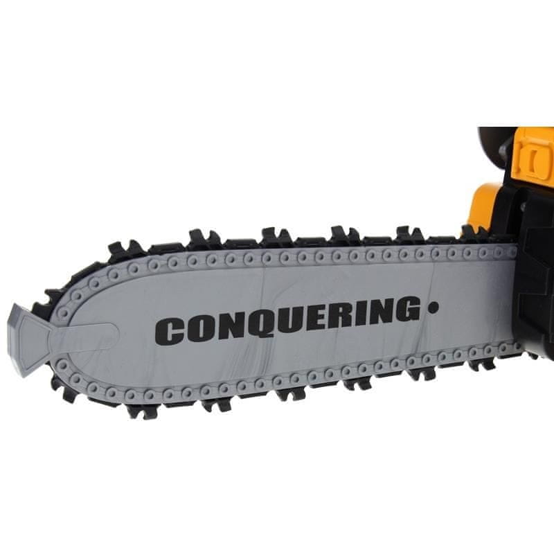 Imitacija zagonske vrvi na levi strani se uporablja za zagon videl. Samo nežno ga potegnite in naprava bo oddala zvok zagona motorja. Za vklop verige pritisnite in držite spodnji gumb na ročaju. Verižica je izdelana iz gume in je popolnoma varna za otroke, realistični zvoki pa bodo vsaki igri dodali novo dimenzijo. Poleg tega je nad verigo lučka, ki se prižge skupaj z motorno žago in pomaga pravemu drvarju pri delu tudi v težkih situacijah. V kompletu dobite tudi nastavljivo zaščitno čelado in naglavno svetilko. Lučka je nameščena na čeladi in jo je mogoče odstraniti tako, da jo povlečete navzgor.