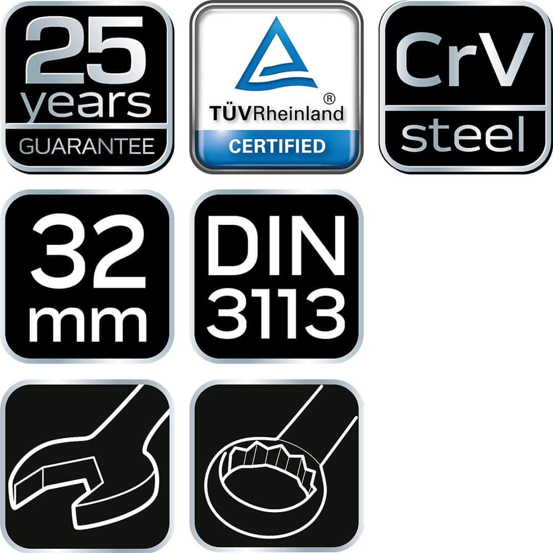 Kombinirani ključ NEO (ref. št. 09–732) meri 32 × 360 mm in je izdelan v skladu s standardom DIN 3113. Visokokakovostno krom-vanadijevo jeklo zagotavlja dolgotrajno vzdržljivost. Kakovost orodja potrjujeta certifikat TÜV in 25-letna garancija proizvajalca. Blagovna znamka NEO izpolnjuje pričakovanja profesionalcev.
