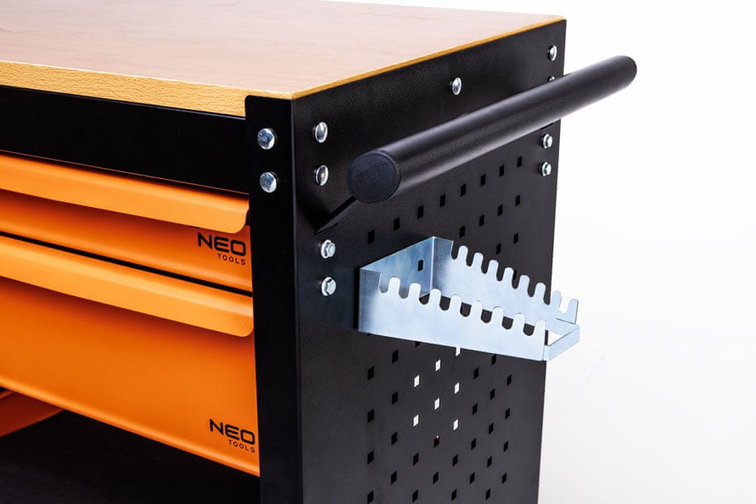 Kavelj za ključe NEO (ref. št. 84–094), izdelan iz jekla, je sestavni del sistema NEO. Zasnovan je za obešanje viličastih, kombiniranih ali obročnih ključev ter omogoča hkratno shranjevanje osmih ključev. Kavelj olajša obešanje ključev, pomaga vzdrževati red in zagotavlja hiter dostop do ključev. Z uporabo različnih komponent sistema NEO si lahko ustvarite svoj idealen prostor za shranjevanje orodja. Blagovna znamka NEO izpolnjuje pričakovanja profesionalcev.