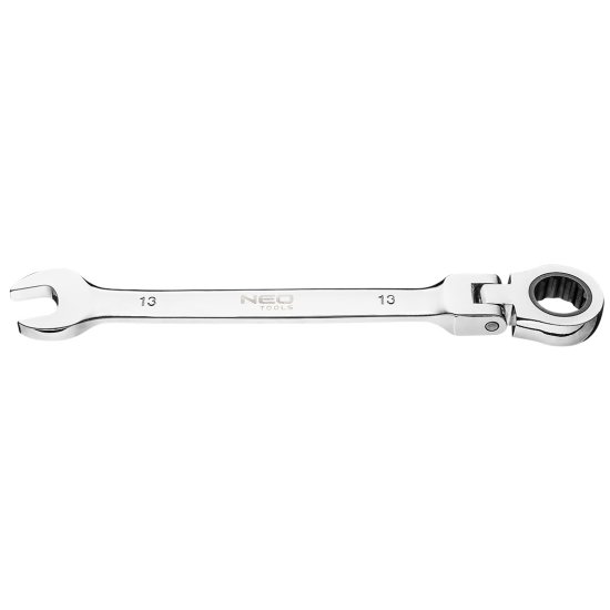 Viličasti ključ NEO 13 × 185 mm z ragljo in zglobom (ref. št. 09–055). 72-zobna raglja v viličastem ključu zagotavlja hitro in natančno delo. Zglob izboljša funkcionalnost ključa. Visokokakovostno krom-vanadijevo jeklo zagotavlja dolgotrajno vzdržljivost. Kakovost orodja potrjuje certifikat TÜV in 25-letna garancija proizvajalca. Blagovna znamka NEO izpolnjuje pričakovanja profesionalcev.