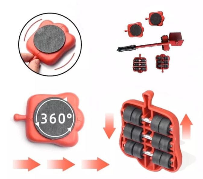 Morate premakniti pohištvo, da preuredite svoj prostor? Ste naveličani premikanja težkega pohištva med čiščenjem? Premikanje pohištva je težka naloga in v večini primerov je ni mogoče opraviti brez napenjanja sklepov in potrebe po pomoči drugih. EASY ROLL je inovativen sistem valjev, sestavljen iz štirih blazinic in dvigala, ki omogoča lažje premikanje težkih predmetov kot kdaj koli prej. S tem edinstvenim kompletom za premikanje pohištva lahko premikate pohištvo sami in brez napora, ne da bi pri tem opraskali ali poškodovali tla.