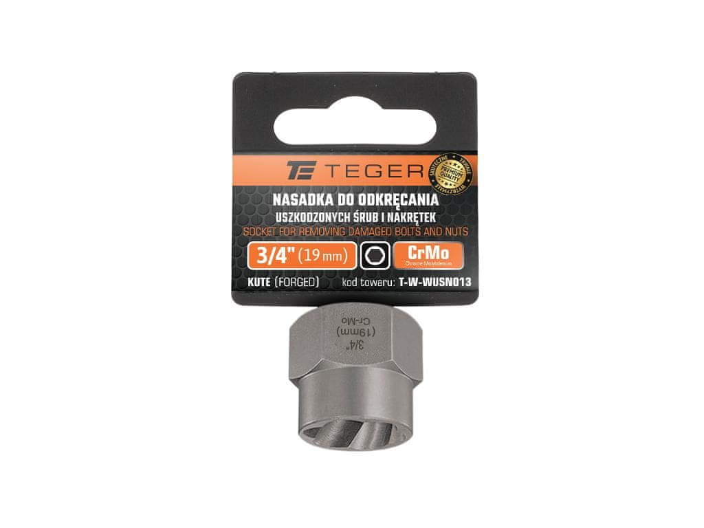 TEGER 3/4" (19 mm) nastavek za poškodovane vijake in matice – kovan / Cr-Mo jeklo / je visokokakovostno orodje, zasnovano za učinkovito odstranjevanje poškodovanih vijakov, matic in zatičev. Izdelano iz trpežnega, kovanega krom-molibdenovega (Cr-Mo) jekla zagotavlja visoko odpornost proti obrabi in dolgo življenjsko dobo. Posebno zasnovana notranja oblika nastavka omogoča učinkovito prijemanje poškodovanih elementov in njihova enostavna odstranitev Indeks kompleta: T-W-WUS002