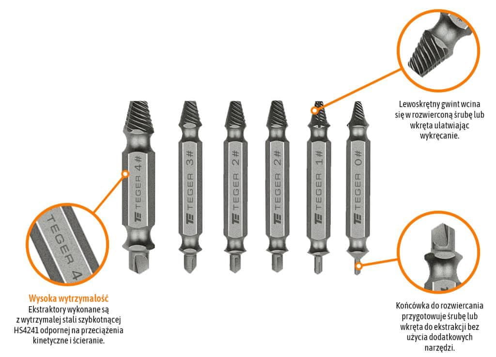 6-delni komplet za odstranjevanje vijakov za poškodovane sornike in vijake TEGER je profesionalni komplet posebnih levičarskih izvlekov za odtrgane in polomljene vijake in vijake. Zasnovan za odvijanje vijakov z uporabo izvijačev in svedrov. Odstrani najpogostejše vijake: vijake z zarezo, imbus, Torx, Phillips itd. Izdelan iz vzdržljivega visokokakovostnega hitroreznega jekla (HSS4241). Vsebina kompleta: Posebni izvleki vijakov (št. 0 – za vijake z navojem 4 mm | za vijake velikosti 3–4 mm / št. 1 – za vijake z navojem 5 mm | za vijake velikosti 3–4 mm / št. 2 (2 kosa) – za vijake z navojem 6 mm | za vijake velikosti 4–5 mm / št. 3 – za vijake z navojem 8 mm | za vijake velikosti 5–6 mm / št. 4 – za vijake z navojem 10 mm | za vijake velikosti 7–10 mm)
