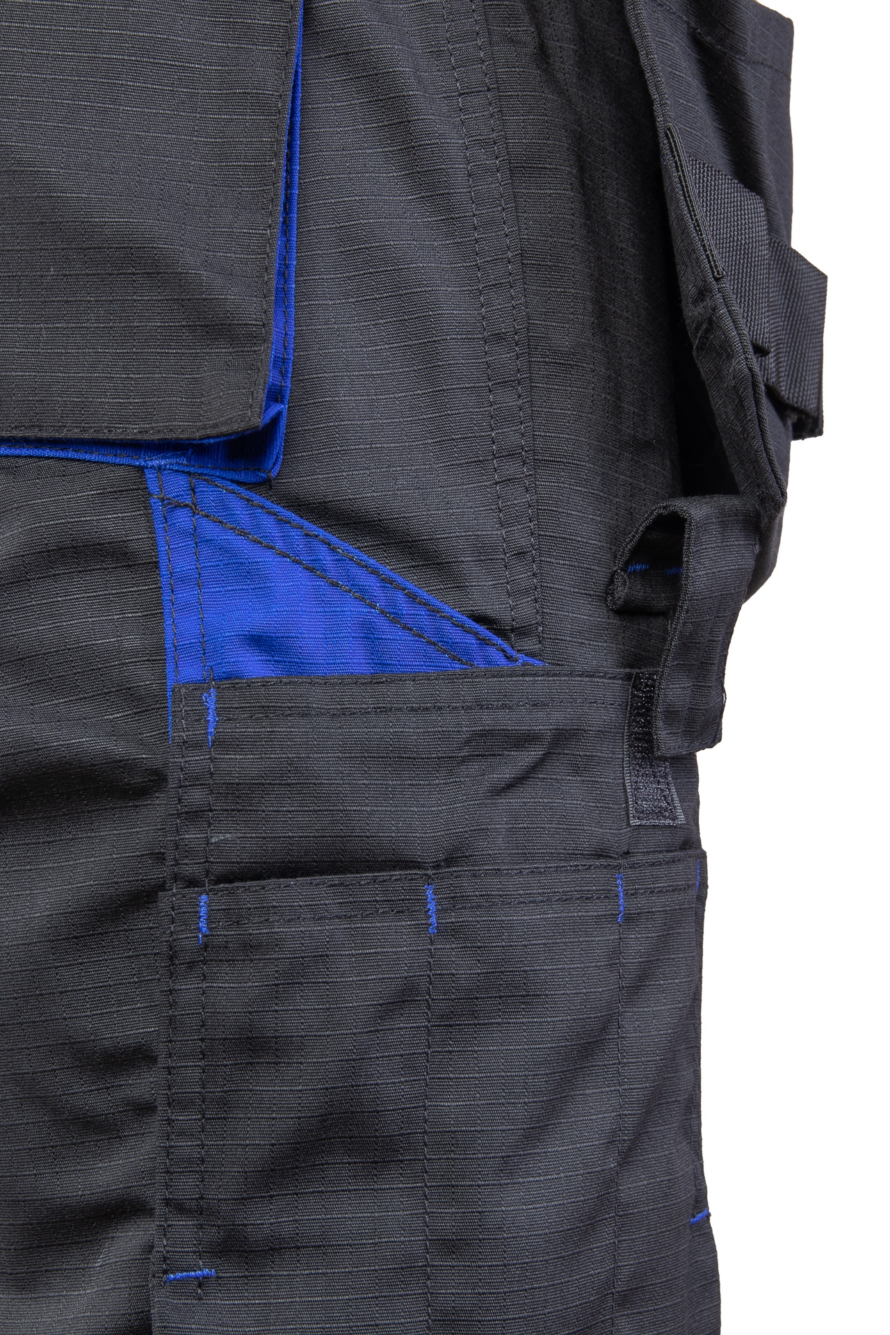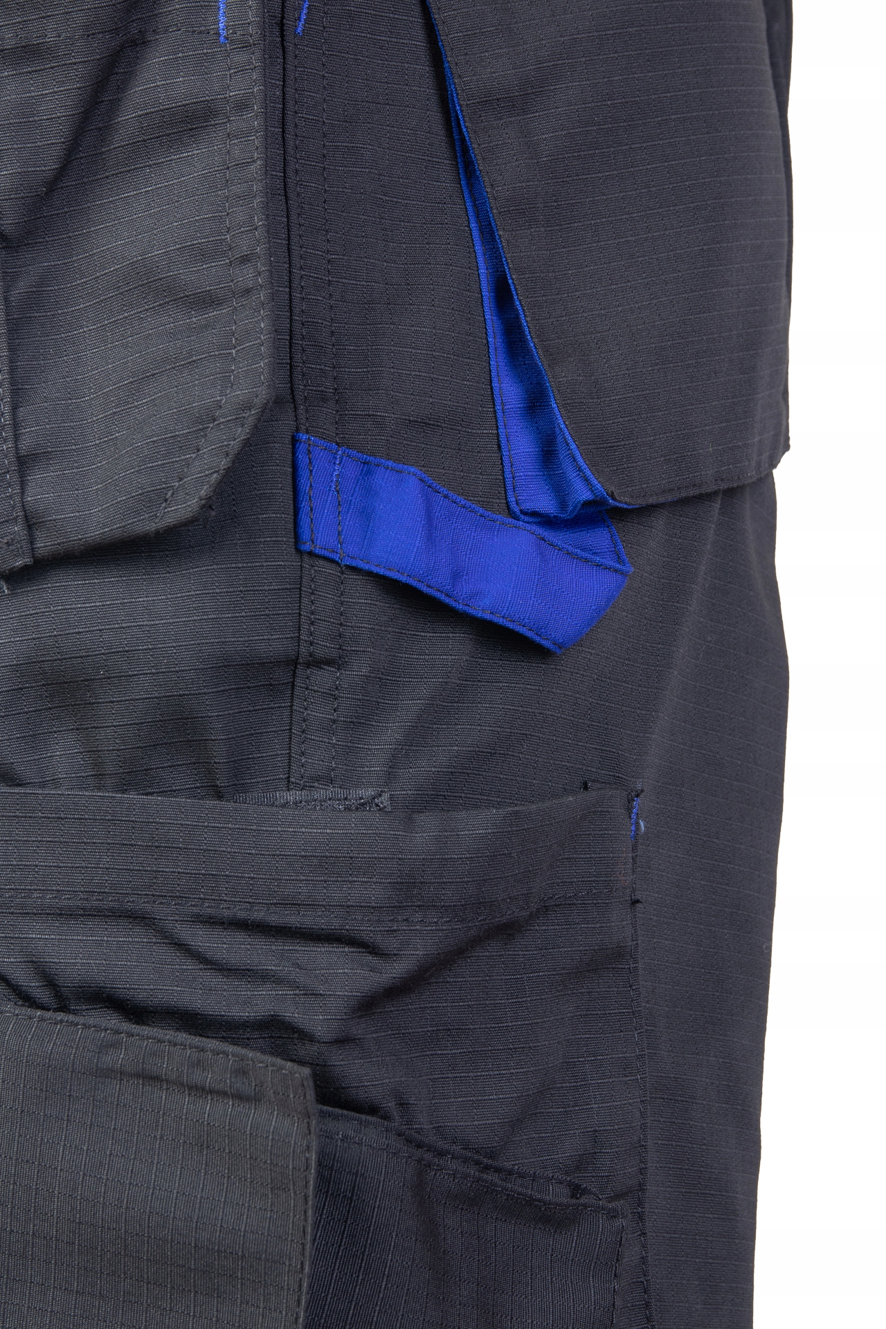 Hlače iz tkanine z značilno karo teksturo (6×6 mm), ojačane z močnejšimi vlakni, dodanimi v enakomernih intervalih (material rip-stop), ki preprečujejo trganje. Nastavljiv pas.