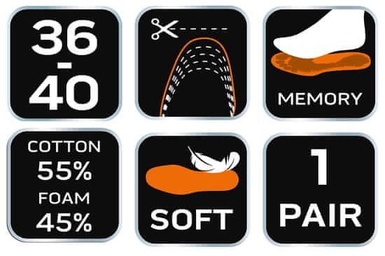Memory vložki za čevlje – velikost 36–40, 82–315 proizvajalca NEO so narejeni iz tekstilne prevleke iz 55% bombaža in 45% poliestra. Dopolnjeno s sodobno plastjo Memory pene, ki doseže avtonomno obliko, ki se popolnoma prilagaja obliki stopala. Preprečujejo nastanek žuljev in podpirajo delovanje stopal. Vložki znamke NEO preprečujejo utrujenost in vplivajo na udobje obutve. Ta model je zasnovan za velikosti od 36 do 40, z možnostjo enostavnega razreza na želeno velikost. Vložki za aktivne ljudi, za zaščitne čevlje in za stoječe delo.