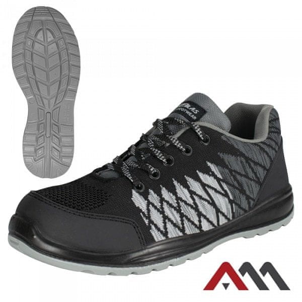 Delovni čevlji s kovinsko kapico. Izdelani iz 100% poliestra Fly-knit tkanine, ki zmanjšuje težo čevlja, povečuje zračnost in zagotavlja visoko udobje. Ojačitev zgornjega sprednjega dela in pete iz TPU materiala. Kovinska kapica ščiti uporabnikove prste pred udarci z energijo 200 +/- 4 J in pred stiskanjem s silo na 15 +/- 0,1 kN. Podplat je izdelan iz poliuretana, vgrajen z neposrednim vbrizgom, sive barve. Spodnji del podplata ščiti pred drsenjem na keramični površini (SRA), olje (FO).