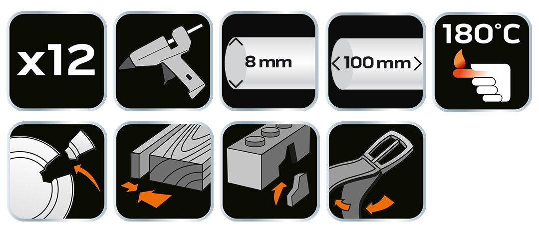NEO 8 mm prozorne lepilne palice, pakiranje po 12 kosov (17–180) so fleksibilne, podolgovate kartuše za lepilne pištole, na voljo v pakiranju po 12 kosov. Priporočljive so za univerzalno uporabo (doma, v delavnici ali mizarski delavnici). Palčke so široke 8 mm in dolge 100 mm. Po segrevanju in uporabi ostanejo prozorne, kar zmanjšuje sledi lepljenja. Priporočljive za uporabo z napravami NEO in GRAPHITE. Imajo certifikat PZH.