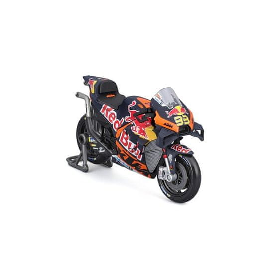 Motocikel GP Racing 1:18 Red Bull KTM Factory Racing 2023, #33 Brad Binder. Model uradno licencirane dirkaške ekipe ima zelo popolno, podrobno izvedbo posameznih delov in kakovostno barvno shemo. Kovinski model s plastičnimi podrobnostmi. Model ima prosto vrteča se kolesa in vključuje podporno stojalo. Pakiran v škatli. Ni primerno za otroke, mlajše od 3 let. Mere paketa: 10,5 × 17,1 × 7 cm. Starost: 3+