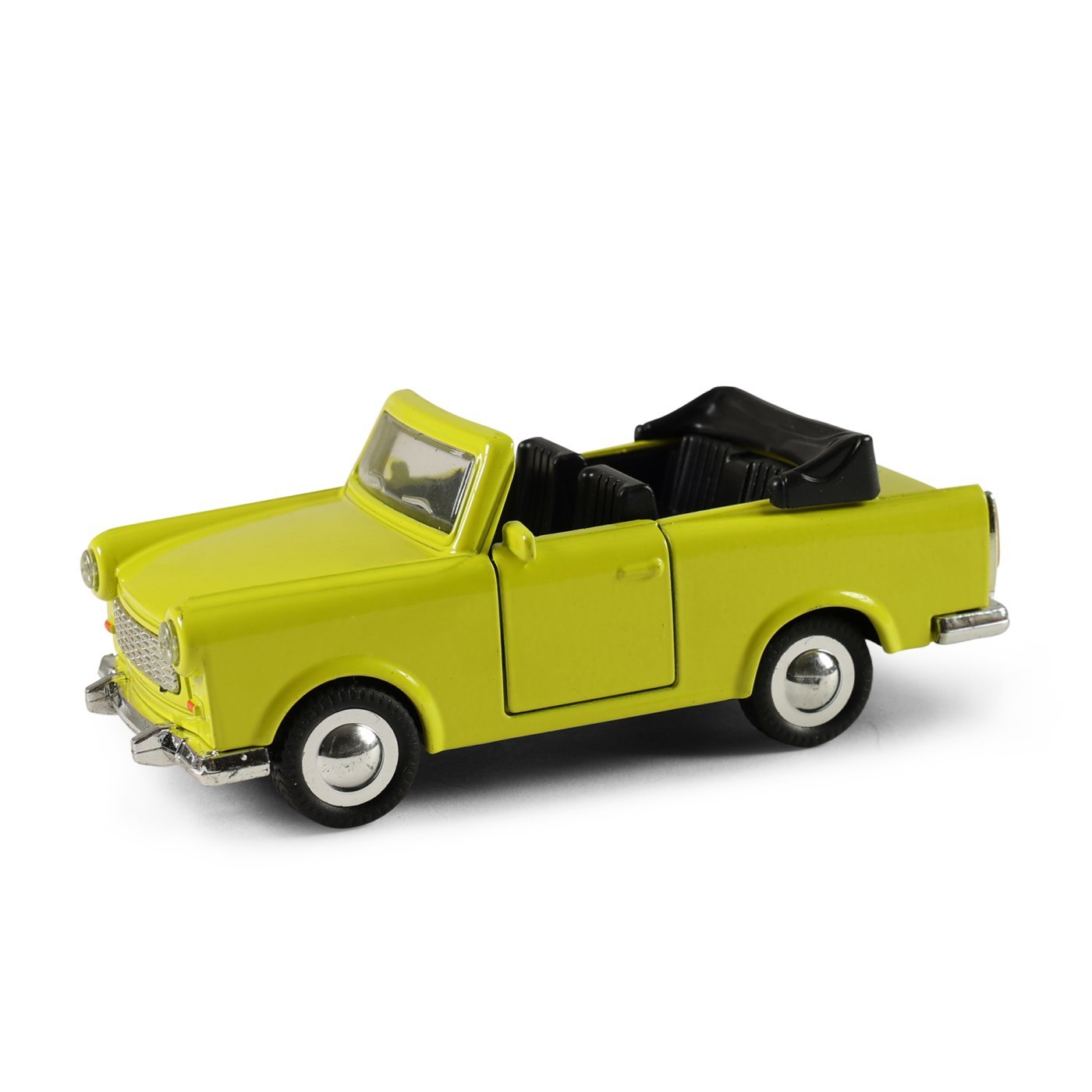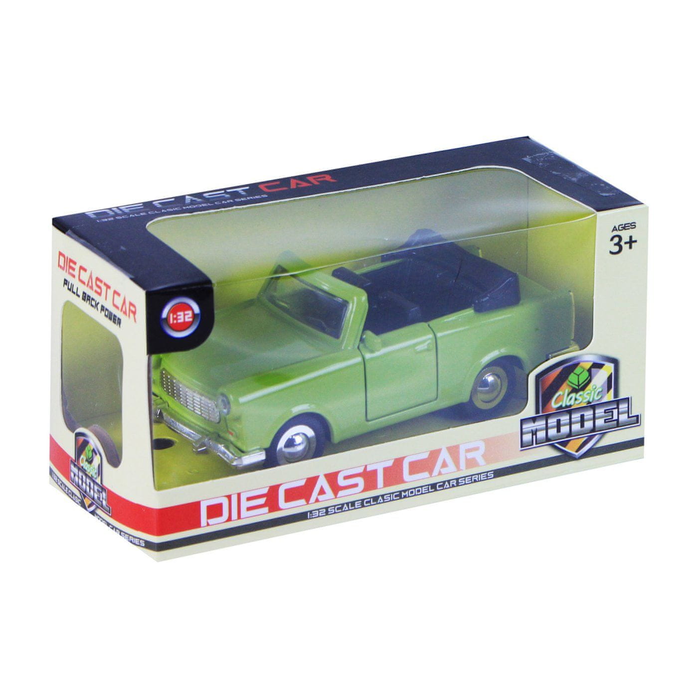 Kovinski avto trabant kabriolet v različnih barvah. Avtomobil deluje na vzvratni vztrajnik. Nostalgija na štirih kolesih. Merilo 1:32.