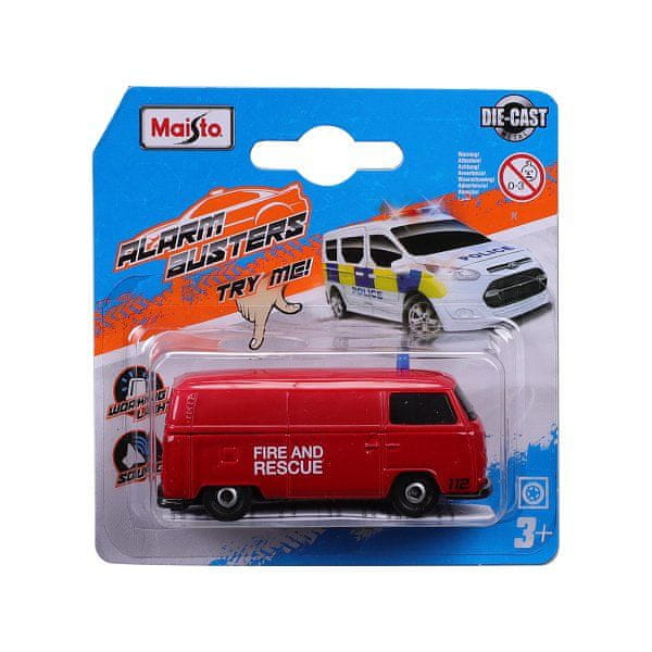 Prebojniki alarma. Kovinski modeli avtomobilov s plastičnimi dodatki. Avtomobili nimajo odpiralnih vrat. Modeli so opremljeni z utripajočo modro lučjo in sireno. Pakirani so v blister paketu. Avtomobili Alarm Buster so različna vozila reševalnih služb, vključno s projekti policije, gasilcev in reševalcev. Ni primerno za otroke, mlajše od 3 let. Asorti je naključna mešanica modelov. Na izbor ni mogoče vplivati. Vključuje baterije 3×AG3. Dolžina vozila približno 7,5 cm. Dimenzije paketa: 3,5 × 10,8 × 10,8 cm. Starost: 3+