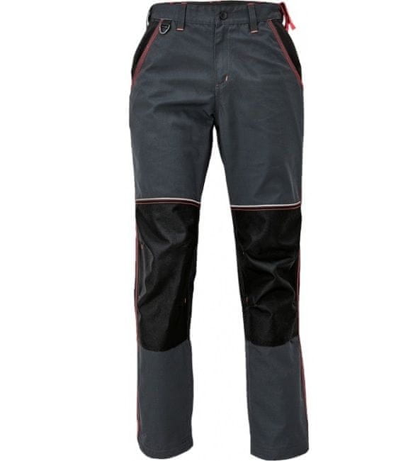 2 stranska žepa; D-obroč za pritrditev osebne izkaznice; 2 žepa s preklopom na zadnji strani; zanka za orodje v kontrastni barvi; ojačani kolenski deli z vhodom za kolenske ščitnike; raztegljiva dolžina nog 5 cm; ojačan zadnji del spodnje noge; okrasni šivi in ​​kontrastni detajli v hi-vis barvi.