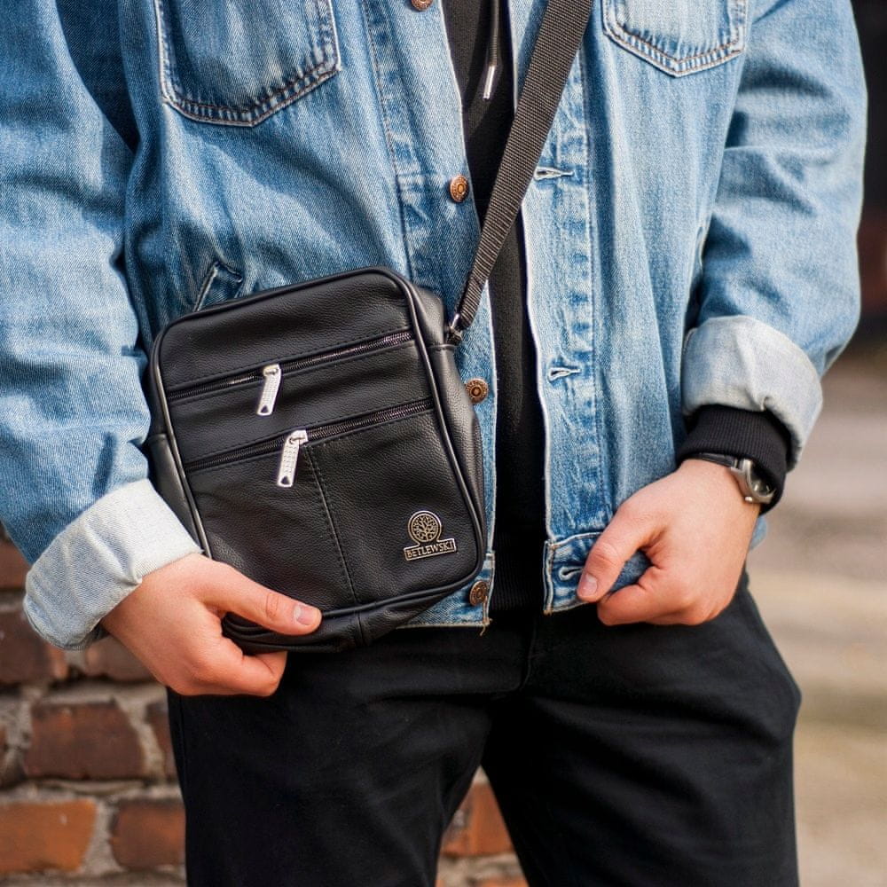 Moška usnjena torba za čez ramo, znamke Betlewski. ZAKAJ TORBA ZNAMKE BETLEWSKI? Kupujete izdelek, izdelan na Poljskem iz naravnega govejega usnja, edinstven dizajn, primeren za format A-5 NA KRATKO indeks: BTG-08 surovina: naravno usnje znamka: BETLEWSKI širina: 18 cm višina: 22 cm globina: 6,5 cm dolžina traku: 140 cm dodatne informacije: POLJSKI IZDELEK IZDELEK ZNAMKE Izdelek ima edinstvene podrobnosti, ki potrjujejo izvirnost izdelka, kot so kartonske in materialne etikete ter kovinski logotip znamke v črni in srebrni barvi. Na torbo je priložen vzorec usnja, iz katerega je bila izdelana. Brezčasna oblika in popolna embalaža torbe zagotavljata, da bo to uspešno in edinstveno darilo za moškega vseh starosti! MOŠKA TORBA Z RAMENSKIM TRAKOM Torba ima dolg, blagajnast trak z nastavljivo dolžino [maks. 160 cm], za nošenje na rami. Izdelek ima masivne kovinske elemente, kot so zadrge in ročaji srebrne barve. PROSTORNA NOTRANJOST Glavni, največji predal torbe se zapira z zadrgo. Primerno za format A5. VODORAVNI ŽEPI Spredaj sta 2 vodoravna žepa z zadrgo. POTRDILO O AVTENTIČNOSTI Izdelku je priloženo potrdilo o avtentičnosti, ki potrjuje kakovost usnja, iz katerega je bil izdelan. Ta dodatek poudarja edinstvenost in izvirnost izdelka, kar je še dodatno cenjeno, če je denarnica darilo. DEKORATIVNI OBESEK ZA KLJUČE Ob vsakem naročilu (ne ob vsakem artiklu) prejmemo 1 brezplačen dekorativni obesek za ključe z logotipom blagovne znamke v beli in srebrni barvi. Obesek za ključe bo dobro izgledal na vaši torbi ali ključih.