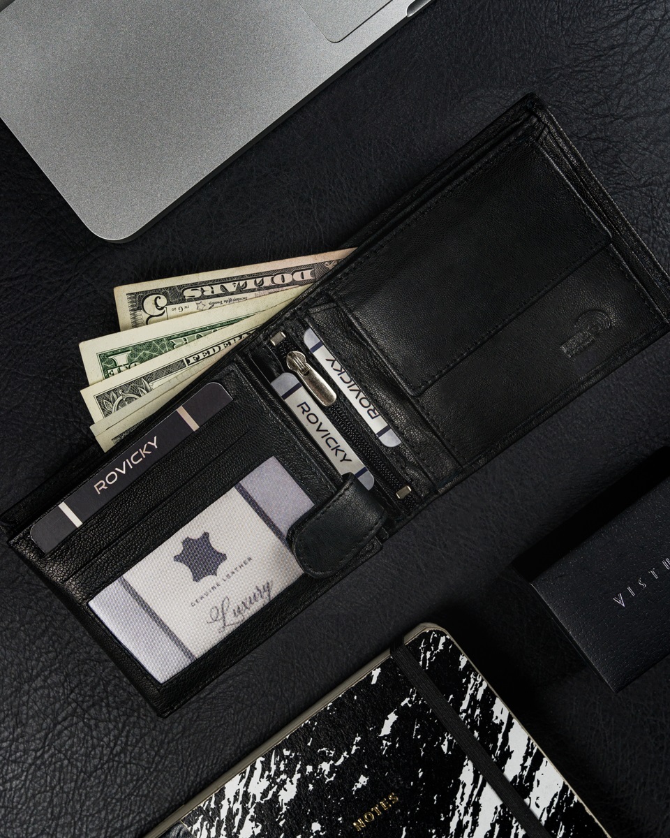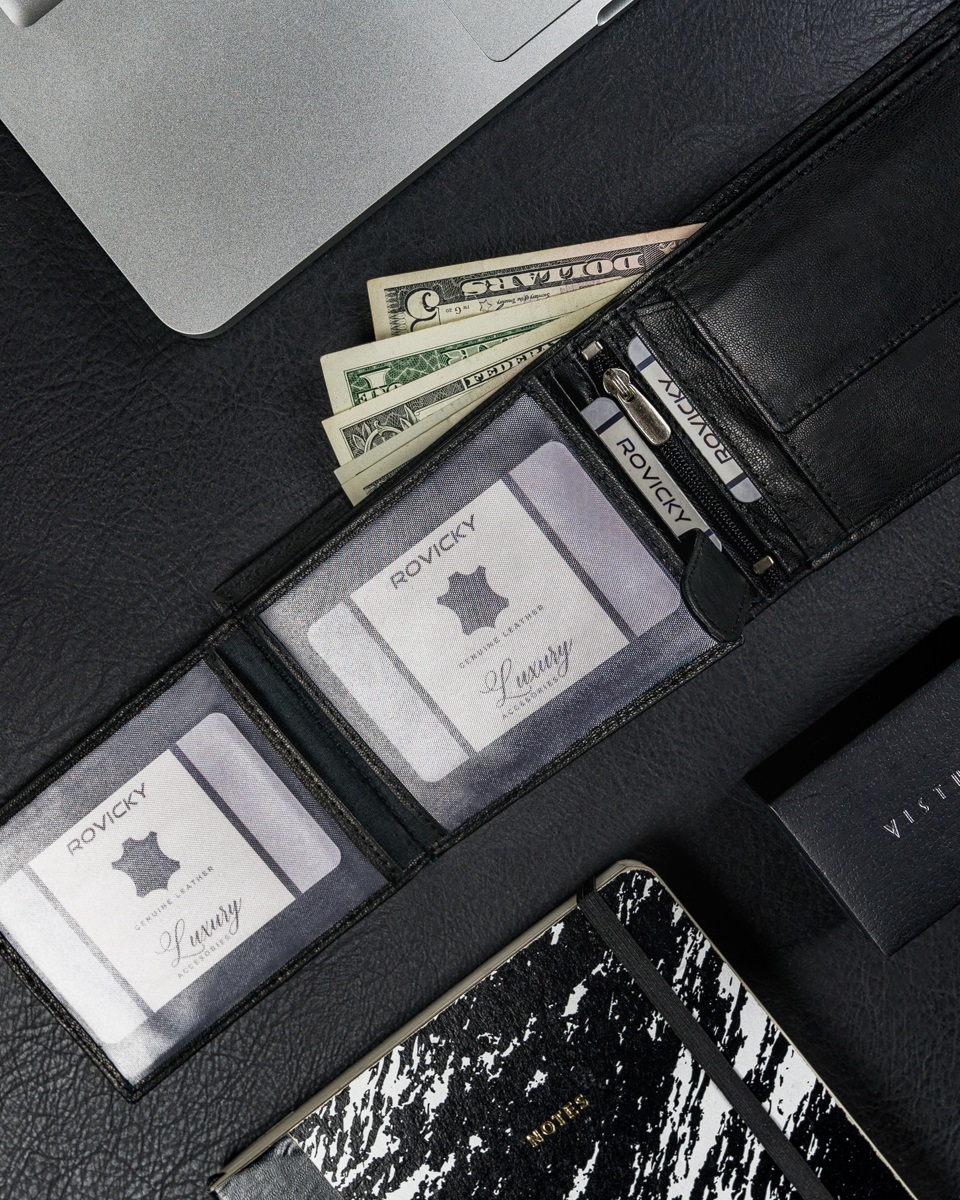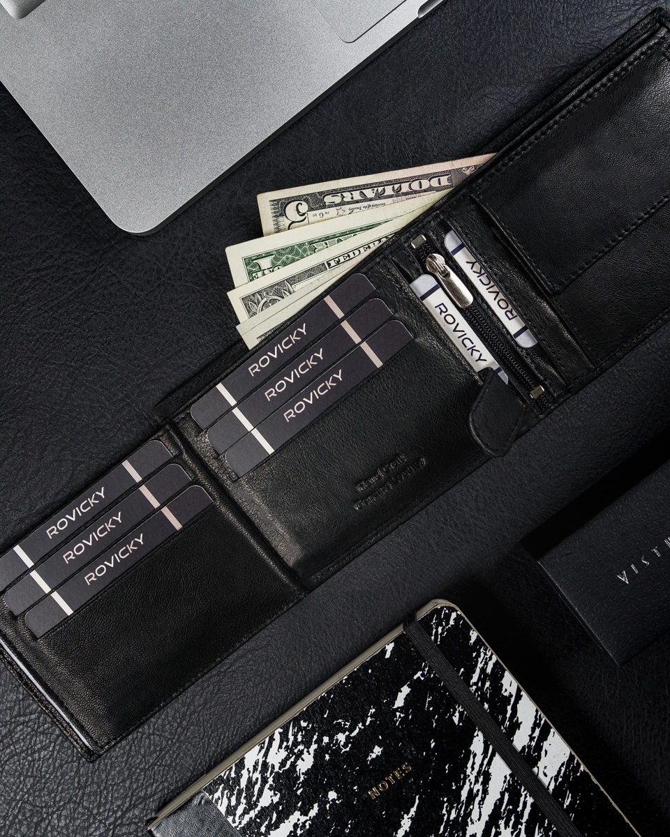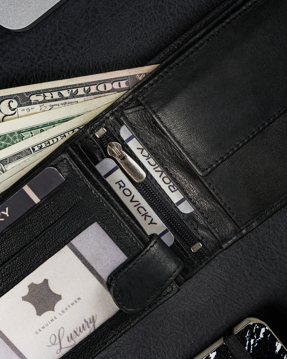 RFID se nanaša na tehnologijo, ki za prenos podatkov uporablja radijske valove. Uporablja se v tehnologiji brezstičnih bančnih kartic. Denarnice Rovicky, zaščitene z RFID, imajo v notranjosti poseben material, ki ščiti bančne kartice pred napadi RFID bralnikov. Kako deluje: Če imate denarnico v žepu hlač, jakne itd., lahko nekdo postavi čitalnik črtne kode blizu vašega žepa in skenira podatke o vaši kartici. Če je vaša kartica v denarnici, zaščiteni z RFID, čitalnik ne bo deloval. Vaše kartice/denar so varni!