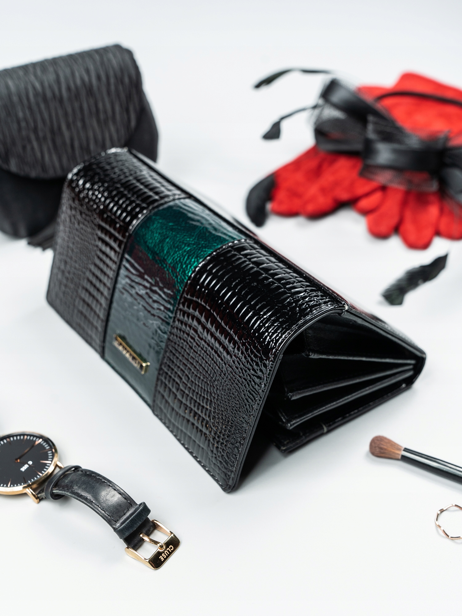 Osupljiva ženska denarnica z neverjetnim vzorcem v temno zeleni barvi.